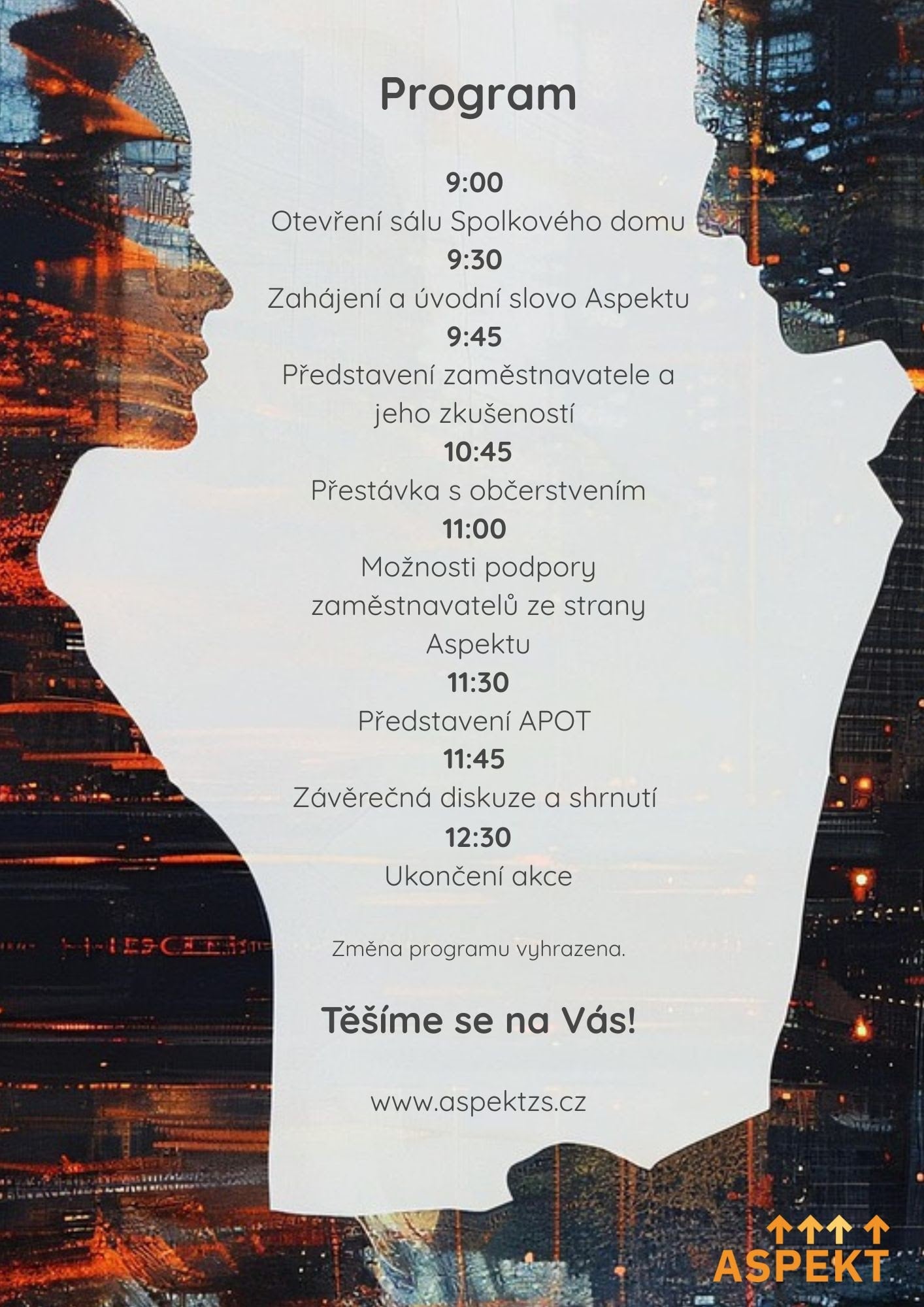 Akce začíná v 9:30 (sál se otevírá od 9:00) a potrvá přibližně do 12:30. Součástí je i přestávka s občerstvením.