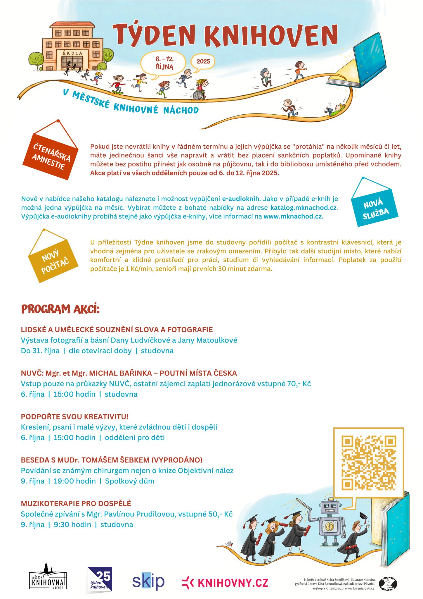 Městská knihovna Náchod vás zve od 6. října 2025 na Týden knihoven, který je letos zaměřený na propagaci národních knihovních služeb, online přístupu ke knihám a jejich dostupnosti kdykoliv a odkudkoliv.