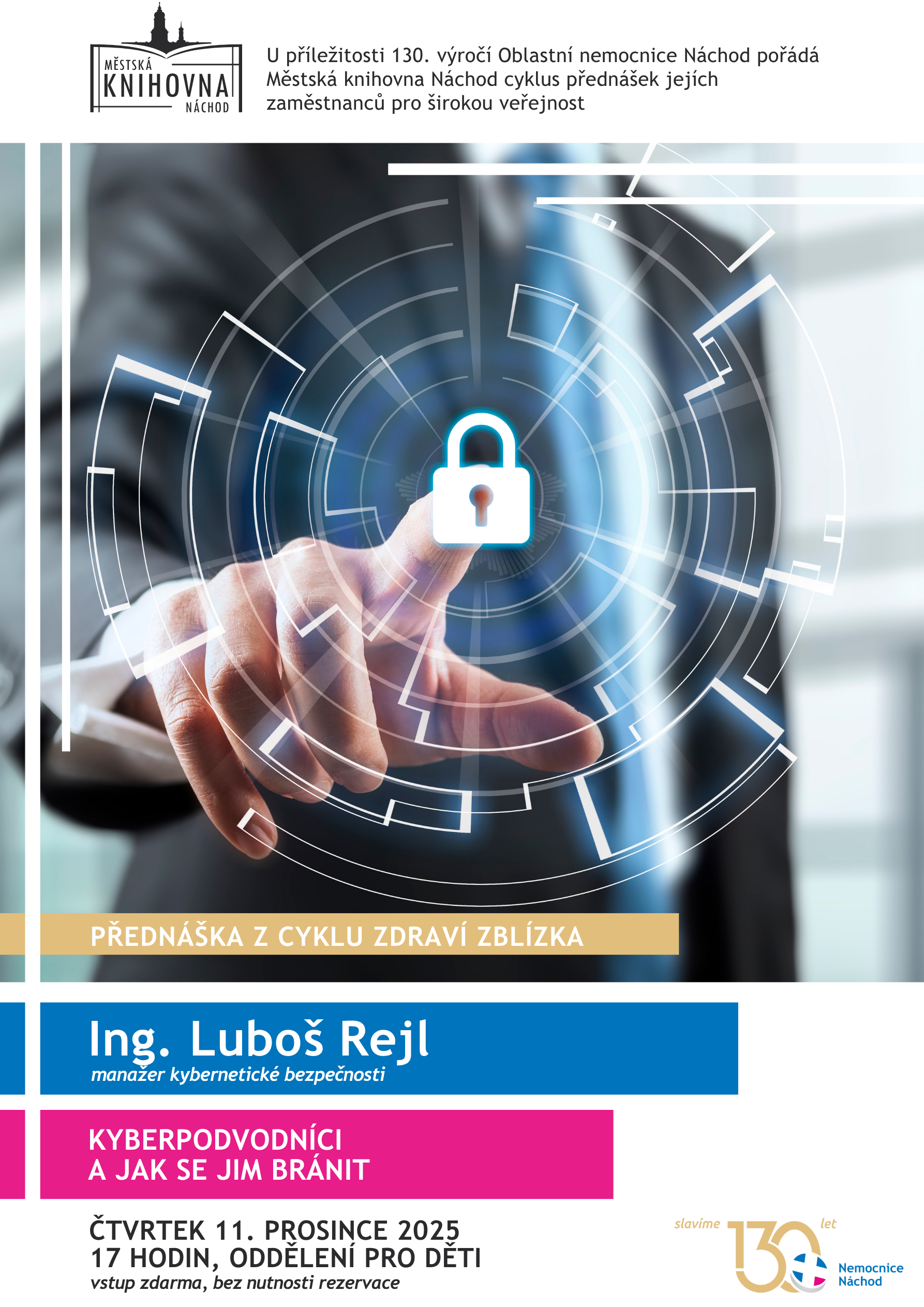 Městská knihovna Náchod vás srdečně zve na cyklus přednášek zaměstnanců Oblastní nemocnice Náchod, pořádaný u příležitosti 130. výročí jejího založení.