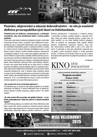 20 V%u00ddSTAVA, SKAUTI N%u00c1CHODSK%u00dd%u2009 ZPRAVODAJPo%u017e%u00e1dali jsme Ivu Rejlovou, marketingovou a obchodn%u00ed mana%u017eerku, aby n%u00e1m p%u0159edstavila l%u00e1zn%u011b z trochu jin%u00e9ho pohledu.%u201eDnes jsou na%u0161e l%u00e1zn%u011b modern%u00edmi za%u0159%u00edzen%u00edmi, kter%u00e1 si v%u0161ak st%u00e1le uchov%u00e1vaj%u00ed kouzlo d%u00e1vno minul%u00fdch dob. N%u00e1dhern%u00e9 prvorepublikov%u00e9 vily a impozantn%u00ed Masaryk%u016fv d%u016fm jsou zasazeny do rozlehl%u00e9ho l%u00e1ze%u0148sk%u00e9ho parku a nab%u00edzej%u00ed komfort a slu%u017eby 21. stolet%u00ed. Krom%u011b tradi%u010dn%u00ed l%u00e9%u010debn%u011b-rehabilita%u010dn%u00ed p%u00e9%u010de si na%u0161i klienti mohou vyb%u00edrat z %u0161irok%u00e9 nab%u00eddky wellness, relaxa%u010dn%u00edch a l%u00e9%u010debn%u00fdch pobyt%u016f. A t%u00edm v%u00fd%u010det na%u0161%u00ed nab%u00eddky rozhodn%u011b nekon%u010d%u00ed. M%u016f%u017eete si vybrat tak%u00e9 z nab%u00eddky bal%u00ed%u010dk%u016f wellness procedur, kter%u00e9 jsou skv%u011bl%u00e9 pro zklidn%u011bn%u00ed t%u011bla i mysli. Str%u00e1vit p%u0159%u00edjemn%u011b p%u00e1r hodin mezi procedurami m%u016f%u017eete v na%u0161%u00ed l%u00e1ze%u0148sk%u00e9 kav%u00e1rn%u011b, parku nebo l%u00e1ze%u0148sk%u00e9 restauraci D%u016fm pod Ka%u0161tany. Mysl%u00edm, %u017ee jsem v%u00e1m pr%u00e1v%u011b dala skv%u011bl%u00fd tip na v%u00fdlet, kter%u00fd si m%u016f%u017eete zpest%u0159it i prohl%u00eddkou na%u0161eho bl%u00edzk%u00e9ho okol%u00ed. To uspokoj%u00ed milovn%u00edky objevov%u00e1n%u00ed n%u00e1dhern%u00e9ho Kladsk%u00e9ho pomez%u00ed, kter%u00e9 nab%u00edz%u00ed nespo%u010det atraktivn%u00edch m%u00edst. V dosahu m%u00e1te malebn%u00e1 m%u011bsta a vesnice, kter%u00e1 m%u016f%u017eete prozkoumat a vychutnat si tak kouzlo %u010desk%u00e9 krajiny, jej%u00ed pam%u011btihodnosti a kulturn%u011b-spole%u010densk%u00fdch zastaven%u00ed. A to i na elektrokolech, kter%u00e1 si jako na%u0161i klienti m%u016f%u017eete zap%u016fj%u010dit na recepci Masarykova domu.%u201eNo, mus%u00edm %u0159%u00edct, %u017ee to zn%u00ed hodn%u011b zaj%u00edmav%u011b.%u201c %u201eTo rozhodn%u011b ano, a umocn%u00ed to v%u00e1%u0161 vlastn%u00ed pro%u017eitek, to mi v%u011b%u0159te%u201c, pokra%u010duje Iva Rejlov%u00e1. %u201eV tomto hektick%u00e9m %u010dase se ka%u017ed%u00e1 p%u0159%u00edjemn%u011b str%u00e1ven%u00e1 chvilka propisuje %u201ezlat%u00fdm perem%u201c do na%u0161ich vztah%u016f.%u201c%u201eTo v%u00e1m mus%u00edm d%u00e1t za pravdu, ale zp%u00e1tky k l%u00e1zn%u00edm %u2013 co nab%u00edz%u00edte %u201ekolemjdouc%u00edm%u201c, tedy t%u011bm, kte%u0159%u00ed se v l%u00e1zn%u00edch aktu%u00e1ln%u011b nel%u00e9%u010d%u00ed?%u201c %u201eU%u017e te%u010f %u0018ni%u0161uj%u00ed p%u0159%u00edpravy na tradi%u010dn%u00ed akci Mise Velichovky, kde letos uct%u00edme 80. v%u00fdro%u010d%u00ed svobody po ukon%u010den%u00ed druh%u00e9 sv%u011btov%u00e9 v%u00e1lky, kter%u00e1 m%u011bla historick%u00fd vliv na provoz na%u0161ich l%u00e1zn%u00ed. Krom%u011b n%u011bmeck%u00e9ho dobov%u00e9ho t%u00e1bora poln%u00edho %u010detnictva a poln%u00edho KINO DUMPOD KASTANY%u00b0%u030cProgram B%u0159ezen 2023: www.velichovky.czwww.velichovky.cz | obchod@lazne1Zveme v%u00e1sU%u017d%u00cdJTE SI ODPOLEDNE D%u016fm pod Ka%u0161tanyochutnat vybran%u00e9 speciality a dob%u0159e na%u010depovan%u00e9 pivo zna%u010dky Pilsner Urquell. P%u0159%u00edj%u010fte do RestauraceT%u011b%u0161%u00edme se na Va%u0161i n%u00e1v%u0161t%u011bvu. T%u00fdm restaurace D%u016fm pod Ka%u0161tany. Akce plat%u00ed na cel%u00fd m%u011bs%u00edc b%u0159ezen 2023Kup%u00f3n na welcome drink zdarma k n%u00e1kupu vstupenky v na%u0161%u00ed restauraci v Dom%u011b pod Ka%u0161tany.Akce plat%u00ed na cel%u00fd m%u011bs%u00edc b%u0159ezen 2023Ke ka%u017ed%u00e9 objedn%u00e1vce z wellness nab%u00eddky obdrv na%u0161%u00ed L%u00e1ze%u0148sk%u00e9 kav%u00e1rn%u011b k%u00e1vu a n%u00e1%u0161 dom%u00e1c%u00ed %u0161tVybrat si m%u016f%u017eete z na%u0161%u00ed %u0161irok%u00e9 nab%u00eddky:Anticelulitidn%u00ed bal%u00ed%u010dek %u2022 %u010cokol%u00e1dov%u00e9 pohlazen%u00ed %u2022Lemongrassov%u00fd sen %u2022 Medov%u00e9 kouzlo %u2022 Pivn%u00ed h%u00fd%u010dL%u00e1zn%u011b Velichovky lazkr%u00e1sn%u00e9 prost%u0159ed%u00ed, skv%u011bl%u00e9 ffllmy, popcornProgram na m%u011bs%u00edcDuben 2025v%u00edce informac%u00ed na www.velichovky.czT%u011b%u0161%u00edme se na V%u00e1s.www.velichovky.cz | obchod@lazne1897.cz | +420 491 889 888lazne_velichovky_1897Pozn%u00e1n%u00ed, objevov%u00e1n%u00ed a %u00fa%u017easn%u00e1 dobrodru%u017estv%u00ed %u2013 to v%u0161e je sou%u010d%u00e1st%u00ed definice prvorepublikov%u00fdch l%u00e1zn%u00ed ve Velichovk%u00e1ch.lazaretu p%u0159edstav%u00edme i historickou a modern%u00ed %u010deskou a americkou arm%u00e1du, modely letadel a vojensk%u00e9 techniky. %u010cek%u00e1 n%u00e1s z%u00e1sah m%u011bstsk%u00e9 policie a jejich ps%u016f, na t%u0159ech podi%u00edch na v%u00e1s %u010dek%u00e1 bohat%u00fd kulturn%u00ed program. T%u011b%u0161it se m%u016f%u017eete na vystoupen%u00ed d%u011bt%u00ed, kapely, d%u011btsk%u00e9 atrakce, loutkoherce, laserovou st%u0159elnici, kurz p%u0159e%u017eit%u00ed, zdravov%u011bdu, kvalitn%u00ed j%u00eddlo a pit%u00ed a t%u00edm v%u00fd%u010det nekon%u010d%u00ed. A p%u0159iznejte si, kdy jste naposledy ochutnali prav%u00fd gul%u00e1%u0161 z poln%u00ed kuchyn%u011b? Datum si ur%u010dit%u011b pozna%u010dte u%u017e te%u010f %u2013 8. kv%u011btna od 10 hodin. T%u011b%u0161%u00edm se na v%u00e1s a v%u011b%u0159%u00edm, %u017ee budete r%u00e1di vzpom%u00ednat na p%u0159%u00edjemn%u011b pro%u017eit%u00fd %u010das v na%u0161ich l%u00e1zn%u00edch.%u201cIva Rejlov%u00e1 6. 4. 2025 J%u00e1, rebelka / 16.30 animovan%u00fd 6. 4. 2025 Gladi%u00e1tor II / 19.00 historick%u00fd, ak%u010dn%u00ed13. 4. 2025 Maria drama / 19.00 %u017eivotopisn%u00fd20. 4. 2025 Zlatovl%u00e1ska / 16.30 poh%u00e1dka20. 4. 2025 Tich%u00e1 po%u0161ta dobrodru%u017en%u00fd / 19.00 rodinn%u00fd27. 4. 202