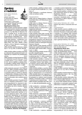 2 ZPR%u00c1VY Z RADNICE N%u00c1CHODSK%u00dd ZPRAVODAJZpr%u00e1vy z radniceRada m%u011bsta N%u00e1choda, 24. 2. 2025 Jedn%u00e1n%u00ed rady m%u011bsta se z%u00fa%u010dastnilo osm radn%u00edch. Jeden byl omluven.%u010c%u00edseln%u00fd popis u zpr%u00e1vy p%u0159edstavuje pom%u011br hlas%u016f p%u0159i hlasov%u00e1n%u00ed PRO %u2013 PROTI %u2013 ZDR%u017dEL SE.Majetkopr%u00e1vn%u00ed %u00fakony obce RM schv%u00e1lila uzav%u0159en%u00ed Smlouvy o n%u00e1jmu nebytov%u00fdch prostor slou%u017e%u00edc%u00edch k podnik%u00e1n%u00ed s %u017eadatelem, na pron%u00e1jem nebytov%u00e9ho prostoru v %u010dp. 929, 930, ul. N%u011bmcov%u00e9, N%u00e1chod, o v%u00fdm%u011b%u0159e 35 m2, na dobu ur%u010ditou od 1. 3. do 31. 12. 2025 s automatick%u00fdm prodlou%u017een%u00edm o kalend%u00e1%u0159n%u00ed rok. 8-0-0 RM schv%u00e1lila uzav%u0159en%u00ed Smlouvy o z%u0159%u00edzen%u00ed v%u011bcn%u00e9ho b%u0159emene %u2013 slu%u017eebnosti v podob%u011b optick%u00e9ho kabelu do p. p. %u010d. 461/1, 490/9, 493/1, 543, 549 a 1962/8, v d%u00e9lce 140,44 m, v%u0161e k.%u00fa. N%u00e1chod, se spole%u010dnost%u00ed N_SYS s.r.o., N%u00e1chod. 8-0-0 RM schv%u00e1lila uzav%u0159en%u00ed Smlouvy o n%u00e1jmu bytu %u010d. 12 v %u010dp. 294, ul. Borsk%u00e1, N%u00e1chod. 8-0-0 RM schv%u00e1lila ud%u011blen%u00ed souhlasu vlastn%u00edka na vyhrazen%u00ed dvou parkovac%u00edch m%u00edst v ul. Tepensk%u00e1 pro %u017eadatele dle p%u0159edlo%u017een%u00e9ho n%u00e1vrhu. 8-0-0 RM schv%u00e1lila uzav%u0159en%u00ed Pachtovn%u00ed smlouvy s %u017eadatelem na pacht %u010d%u00e1sti p.p.%u010d. 675/9, o v%u00fdm%u011b%u0159e 226 m2, a p.p.%u010d. 675/10, o v%u00fdm%u011b%u0159e 4 m2, v%u0161e k.%u00fa. N%u00e1chod, za %u00fa%u010delem z%u0159%u00edzen%u00ed zahr%u00e1dky a %u00fadr%u017eby zelen%u011b. Smlouva se uzav%u00edr%u00e1 na dobu ur%u010ditou od 1. 3. 2025. 8-0-0RM revokovala usnesen%u00ed %u010d. 83/1776/24 ze dne 24. 6. 2024 a schv%u00e1lila cenovou nab%u00eddku na opravu odvodn%u011bn%u00ed a zaji%u0161t%u011bn%u00ed svazu pozemku m%u011bsta p.%u010d. 675/9, k.%u00fa. N%u00e1chod, ul. Vod%u00e1rensk%u00e1 a schv%u00e1lila uzav%u0159en%u00ed objedn%u00e1vky se spole%u010dnost%u00ed HZ Group s.r.o., N%u00e1chod, na proveden%u00ed v%u00fd%u0161e uveden%u00e9 opravy a zaji%u0161t%u011bn%u00ed. 8-0-0 RM schv%u00e1lila povolen%u00ed t%u0159%u00ed parkovac%u00edch m%u00edst na ve%u0159ejn%u00fdch parkovi%u0161t%u00edch a m%u00edstn%u00edch komunikac%u00edch ve vlastnictv%u00ed m%u011bsta pro pot%u0159eby zm%u011bny u%u017e%u00edv%u00e1n%u00ed a rekolaudace objektu %u010dp. 619, ul. Borsk%u00e1, N%u00e1chod, za %u00faplatu. 8-0-0 RM schv%u00e1lila cenovou nab%u00eddku a uzav%u0159en%u00ed objedn%u00e1vky s p. M. Chmel%u00edkem, N%u00e1chod, na realizaci kamerov%u00e9ho syst%u00e9mu ve vybran%u00fdch objektech m%u011bsta. D%u00e1le schv%u00e1lila uzav%u0159en%u00ed objedn%u00e1vky se spole%u010dnost%u00ed EDERA Group a.s., Pardubice, na zaji%u0161t%u011bn%u00ed internetov%u00e9ho p%u0159ipojen%u00ed pro kamerov%u00fd syst%u00e9m. D%u00e1le vzala na v%u011bdom%u00ed, %u017ee odpov%u011bdnou osobou za spr%u00e1vu kamerov%u00fdch z%u00e1znam%u016f byla zvolena osoba z odboru spr%u00e1vy majetku M%u011b%u00da. RM d%u00e1le schv%u00e1lila n%u00e1kup 10 ks fotopast%u00ed Bunaty full HD GSM. 8-0-0P%u0159elo%u017eky s%u00edt%u00ed ve%u0159ejn%u00e9ho osv%u011btlen%u00ed N%u00e1chod %u2013 ul. Bla%u017ekova, Slune%u010dn%u00e1, Na P%u0159ad%u00fdnku 8-0-0 RM rozhodla o p%u0159id%u011blen%u00ed ve%u0159ejn%u00e9 zak%u00e1zky uchaze%u010di RYDVL-ELEKTRO s.r.o., Lomnice n. P. RM souhlasila s uzav%u0159en%u00edm Smlouvy o d%u00edlo na realizaci stavby.TELEGRAFICKY: RM vzala na v%u011bdom%u00ed Zpr%u00e1vy o %u010dinnosti mate%u0159sk%u00fdch %u0161kol a ZU%u0160 N%u00e1chod pro %u0161koln%u00ed rok 2023/24. 8-0-0 RM vzala na v%u011bdom%u00ed V%u00fdro%u010dn%u00ed zpr%u00e1vu M%u011bSSS Marie za rok 2024. 8-0-0 RM schv%u00e1lila s %u00fa%u010dinnost%u00ed od 1. 3. 2025 Sazebn%u00edk %u00fahrad za poskytov%u00e1n%u00ed a zp%u0159%u00edstup%u0148ov%u00e1n%u00ed informac%u00ed. 8-0-0 RM schv%u00e1lila n%u00e1vrh na ocen%u011bn%u00ed p. J. Koliska in memoriam. 8-0-0 RM schv%u00e1lila Ak%u010dn%u00ed pl%u00e1n rozvoje %u0161kol a %u0161kolsk%u00fdch za%u0159%u00edzen%u00ed z%u0159izovan%u00fdch m%u011bstem N%u00e1chod na rok 2025. 8-0-0 RM schv%u00e1lila %u010derp%u00e1n%u00ed fondu investic p%u0159%u00edsp%u011bvkov%u00e9 organizace ZU%u0160 N%u00e1chod dle p%u0159edlo%u017een%u00e9ho n%u00e1vrhu. Finan%u010dn%u00ed prost%u0159edky budou vyu%u017eity na zakoupen%u00ed basov%u00e9ho klarinetu Yamaha. 8-0-0 RM schv%u00e1lila cen%u00edk Zimn%u00edho stadionu N%u00e1chod pro vyu%u017eit%u00ed ledov%u00e9 plochy na obdob%u00ed duben 2025%u2013b%u0159ezen 2026, s %u00fa%u010dinnost%u00ed od 1. 4. 2025. 8-0-0 RM neschv%u00e1lila nab%u00eddku kon%u00e1n%u00ed z%u00e1bavy pro d%u011bti a dosp%u011bl%u00e9 (pouti). -0-0 RM schv%u00e1lila uzav%u0159en%u00ed Smlouvy o kon%u00e1n%u00ed oh%u0148ostroje dne 7. 5. 2025 se spole%u010dnost%u00ed Fireworks service s.r.o., Praha. 8-0-0 RM schv%u00e1lila nab%u00eddku a uzav%u0159en%u00ed objedn%u00e1vky se spole%u010dnost%u00ed Rostislav Dudek %u2013 prov%u00e1d%u011bn%u00ed staveb, Nov%u00e9 M%u011bsto n.M., na realizaci opravy b%u0159ehu %u0159%u00ed%u010dky Ole%u0161enky a %u010d%u00e1sti %u00fa%u010delov%u00e9 komunikace v k.%u00fa. Lip%u00ed u N%u00e1choda. 8-0-0 RM schv%u00e1lila nab%u00eddku a uzav%u0159en%u00ed objedn%u00e1vky se spole%u010dnost%u00ed Technick%u00e9 slu%u017eby N%u00e1chod, na realizaci opravy p%u011b%u0161%u00ed stezky spoluj%u00edc%u00ed ul. Neumannova s ul. Za Trat%u00ed.8-0-0 RM schv%u00e1lila dotaci pro organizaci Tenisov%u00fd klub N%u00e1chod z.s., na %u00fahradu n%u00e1klad%u016f spojen%u00fdch se zm%u011bnou rezervovan%u00e9ho p%u0159%u00edkonu v tenisov%u00e9m are%u00e1lu v souvislosti s v%u00fdstavbou nov%u00e9 tenisov%u00e9 haly. 8-0-0 RM schv%u00e1lila uspo%u0159%u00e1d%u00e1n%u0