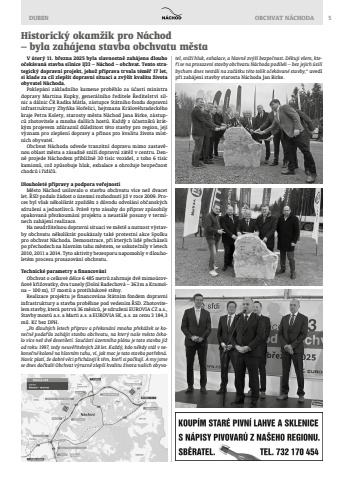 DUBEN OBCHVAT N%u00c1CHODA 5V %u00fater%u00fd 11. b%u0159ezna 2025 byla slavnostn%u011b zah%u00e1jena dlouho o%u010dek%u00e1van%u00e1 stavba silnice I/33 %u2013 N%u00e1chod %u2013 obchvat. Tento strategick%u00fd dopravn%u00ed projekt, jeho%u017e p%u0159%u00edprava trvala t%u00e9m%u011b%u0159 17 let, si klade za c%u00edl zlep%u0161it dopravn%u00ed situaci a zv%u00fd%u0161it kvalitu %u017eivota obyvatel N%u00e1choda.Poklep%u00e1n%u00ed z%u00e1kladn%u00edho kamene prob%u011bhlo za %u00fa%u010dasti ministra dopravy Martina Kupky, gener%u00e1ln%u00edho %u0159editele %u0158editelstv%u00ed silnic a d%u00e1lnic %u010cR Radka M%u00e1tla, z%u00e1stupce St%u00e1tn%u00edho fondu dopravn%u00ed infrastruktury Zby%u0148ka Ho%u0159elici, hejtmana Kr%u00e1lov%u00e9hradeck%u00e9ho kraje Petra Kolety, starosty m%u011bsta N%u00e1chod Jana Birke, z%u00e1stupc%u016f zhotovitele a mnoha dal%u0161%u00edch host%u016f. Ka%u017ed%u00fd z %u00fa%u010dastn%u00edk%u016f kr%u00e1tk%u00fdm projevem zd%u016fraznil d%u016fle%u017eitost t%u00e9to stavby pro region, jej%u00ed v%u00fdznam pro zlep%u0161en%u00ed dopravy a p%u0159%u00ednos pro kvalitu %u017eivota m%u00edstn%u00edch obyvatel.Obchvat N%u00e1choda odvede tranzitn%u00ed dopravu mimo zastav%u011bnou oblast m%u011bsta a z%u00e1sadn%u011b sn%u00ed%u017e%u00ed dopravn%u00ed z%u00e1t%u011b%u017e v centru. Denn%u011b projede N%u00e1chodem p%u0159ibli%u017en%u011b 30 tis%u00edc vozidel, z toho 6 tis%u00edc kamion%u016f, co%u017e zp%u016fsobuje hluk, exhalace a ohro%u017euje bezpe%u010dnost chodc%u016f i %u0159idi%u010d%u016f.Dlouholet%u00e9 p%u0159%u00edpravy a podpora ve%u0159ejnostiM%u011bsto N%u00e1chod usilovalo o stavbu obchvatu v%u00edce ne%u017e dvacet let. %u0158SD podalo %u017e%u00e1dost o %u00fazemn%u00ed rozhodnut%u00ed ji%u017e v roce 2009. Proces byl v%u0161ak n%u011bkolikr%u00e1t zpo%u017ed%u011bn z d%u016fvodu odvol%u00e1n%u00ed ob%u010dansk%u00fdch sdru%u017een%u00ed a jednotlivc%u016f. Pr%u00e1v%u011b tyto z%u00e1sahy do p%u0159%u00edprav zp%u016fsobily opakovan%u00e1 p%u0159ezkoum%u00e1n%u00ed projektu a neust%u00e1l%u00e9 posuny v term%u00ednech zah%u00e1jen%u00ed realizace.Na neudr%u017eitelnou dopravn%u00ed situaci ve m%u011bst%u011b a nutnost v%u00fdstavby obchvatu n%u011bkolikr%u00e1t pouk%u00e1zaly tak%u00e9 protestn%u00ed akce Spolku pro obchvat N%u00e1choda. Demonstrace, p%u0159i kter%u00fdch lid%u00e9 p%u0159ech%u00e1zeli po p%u0159echodech na hlavn%u00edm tahu m%u011bstem, se uskute%u010dnily v letech 2010, 2011 a 2014. Tyto aktivity bezesporu napomohly v dlouholet%u00e9m procesu prosazov%u00e1n%u00ed obchvatu.Technick%u00e9 parametry a fi nancov%u00e1n%u00edObchvat o celkov%u00e9 d%u00e9lce 6 485 metr%u016f zahrnuje dv%u011b mimo%u00farov%u0148ov%u00e9 k%u0159i%u017eovatky, dva tunely (Doln%u00ed Radechov%u00e1 %u2013 363 m a Kramolna %u2013 100 m), 17 most%u016f a protihlukov%u00e9 st%u011bny. Realizace projektu je fi nancov%u00e1na St%u00e1tn%u00edm fondem dopravn%u00ed infrastruktury a stavba prob%u011bhne pod veden%u00edm %u0158SD. Zhotovitelem stavby, kter%u00e1 potrv%u00e1 36 m%u011bs%u00edc%u016f, je sdru%u017een%u00ed EUROVIA CZ a.s., Stavby most%u016f a.s. a Marti a.s. a EUROVIA SK, a.s. za cenu 3 184,3 mil. K%u010d bez DPH.%u201ePo dlouh%u00fdch letech p%u0159%u00edprav a p%u0159ekon%u00e1n%u00ed mnoha p%u0159ek%u00e1%u017eek se kone%u010dn%u011b poda%u0159ilo zah%u00e1jit stavbu obchvatu, na kter%u00fd na%u0161e m%u011bsto %u010dekalo v%u00edce ne%u017e dv%u011b desetilet%u00ed. Sou%u010d%u00e1st%u00ed %u00fazemn%u00edho pl%u00e1nu je tato stavba ji%u017e od roku 1997, tedy neuv%u011b%u0159iteln%u00fdch 28 let. Ka%u017ed%u00fd, kdo n%u011bkdy st%u00e1l v nekone%u010dn%u00e9 kolon%u011b na hlavn%u00edm tahu, v%u00ed, jak moc je tato stavba pot%u0159ebn%u00e1. Nav%u00edc plat%u00ed, %u017ee dobr%u00e9 v%u011bci p%u0159ich%u00e1zej%u00ed k t%u011bm, kte%u0159%u00ed si po%u010dkaj%u00ed. A my jsme se dnes do%u010dkali! Obchvat v%u00fdrazn%u011b zlep%u0161%u00ed kvalitu %u017eivota na%u0161ich obyvaHistorick%u00fd okam%u017eik pro N%u00e1chod %u2013 byla zah%u00e1jena stavba obchvatu m%u011bstatel, sn%u00ed%u017e%u00ed hluk, exhalace, a hlavn%u011b zv%u00fd%u0161%u00ed bezpe%u010dnost. D%u011bkuji v%u0161em, kte%u0159%u00ed se na prosazen%u00ed stavby obchvatu N%u00e1choda pod%u00edleli %u2013 bez jejich %u00fasil%u00ed bychom dnes nest%u00e1li na za%u010d%u00e1tku t%u00e9to tolik o%u010dek%u00e1van%u00e9 stavby,%u201c uvedl p%u0159i zah%u00e1jen%u00ed stavby starosta N%u00e1choda Jan Birke.