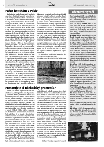 6 V%u00ddRO%u010c%u00cd, VZPOM%u00cdNKY N%u00c1CHODSK%u00dd%u2009 ZPRAVODAJB%u0159eznov%u00e1 v%u00fdro%u010d%u00edDne 1. dubna 2005 zem%u0159el Ladislav Novotn%u00fd, zaslou%u017eil%u00fd kulturn%u00ed pracovn%u00edk a dlouholet%u00fd %u0159editel N%u00e1chodsk%u00e9ho kulturn%u00edho st%u0159ediska.P%u0159ed 185 lety (2. dubna 1840) se narodil Jan Karel Hra%u0161e, archeolog, historik, pedagog a spisovatel, jeho%u017e dvoud%u00edln%u00e9 d%u00edlo D%u011bjiny N%u00e1choda dodnes pat%u0159%u00ed k nejv%u00fdznamn%u011bj%u0161%u00edm historick%u00fdm d%u00edl%u016fm.5. dubna 1860 se narodil %u010desk%u00fd socha%u0159 %u010cen%u011bk Vosm%u00edk, kter%u00fd pro N%u00e1chod vytvo%u0159il podle n%u00e1vrhu Mikol%u00e1%u0161e Al%u0161e s%u00e1drov%u00fd model sochy ryt%u00ed%u0159e Hrona. 6. dubna 1950 se narodil Zbyn%u011bk Ko%u010dvar, v%u00fdznamn%u00fd grafik a tv%u016frce mnoha kni%u017en%u00edch %u00faprav i po%u0161tovn%u00edch zn%u00e1mek.Dne 9. dubna 1880 se v N%u00e1chod%u011b narodil sv%u011btov%u011b uzn%u00e1van%u00fd architekt Ing. Jan Letzel. Sv%u00fdm p%u016fsoben%u00edm v Japonsku se zapsal do historie, zejm%u00e9na jako autor Pr%u016fmyslov%u00e9ho pal%u00e1ce v Hiro%u0161im%u011b, dnes zn%u00e1m%u00e9ho jako Atomov%u00fd d%u00f3m, kter%u00fd p%u0159e%u010dkal v%u00fdbuch atomov%u00e9 bomby.10. dubna 1925 si p%u0159ipom%u00edn%u00e1me nedo%u017eit%u00e9 100. narozeniny Vil%u00e9ma P%u0159ibyla, opern%u00edho p%u011bvce a jednoho z nejv%u00fdznamn%u011bj%u0161%u00edch %u010desk%u00fdch tenorist%u016f sv%u00e9 doby. V dubnu 1990 mu bylo ud%u011bleno %u010destn%u00e9 ob%u010danstv%u00ed m%u011bsta N%u00e1choda.15. dubna 1915 se narodila prof. Hilda Prislingerov%u00e1, kter%u00e1 na zdej%u0161%u00ed Z%u00e1kladn%u00ed um%u011bleck%u00e9 %u0161kole vyu%u010dovala hru na klav%u00edr a doprov%u00e1zela %u010dleny P%u011bveck%u00e9ho sboru Hron p%u0159i koncertn%u00edch vystoupen%u00edch.P%u0159ed 140 lety (19. dubna 1885) se v N%u00e1chod%u011b narodil Ing. V%u00e1clav %u0160r%u016ftek, stavitel, mal%u00ed%u0159 a hudebn%u00ed skladatel.23. dubna 1420 se narodil Ji%u0159%u00ed z Pod%u011bbrad, zn%u00e1m%u00fd jako %u201ehusitsk%u00fd kr%u00e1l%u201c. Po smrti sv%u00e9ho otce, Viktor%u00edna z Kun%u0161t%u00e1tu a Pod%u011bbrad, zd%u011bdil n%u00e1chodsk%u00e9 panstv%u00ed.V dubnu 1865 byla dostav%u011bna p%u0159%u00e1delna lnu v Bab%u00ed, prvn%u00ed n%u00e1chodsk%u00e1 tov%u00e1rna.26. dubna 1914 bylo slavnostn%u011b otev%u0159eno M%u011bstsk%u00e9 divadlo Dr. J. %u010c%u00ed%u017eka. Prvn%u00edm uveden%u00fdm divadeln%u00edm p%u0159edstaven%u00edm bylo drama Jan %u017di%u017eka od Aloise Jir%u00e1ska.Ke koloritu osady Peklo pat%u0159il po %u0159adu desetilet%u00ed obydlen%u00fd hausb%u00f3t kotv%u00edc%u00ed v %u0159e%u010di%u0161ti Metuje p%u0159ed soutokem s Ole%u0161enkou u d%u0159ev%u011bn%u00e9ho mostu sm%u011brem na Ostrovy. Dnes je ji%u017e minulost%u00ed. Tento %u010dl%u00e1nek se ohl%u00ed%u017e%u00ed za jeho histori%u00ed, kter%u00e1 je sou%u010d%u00e1st%u00ed ned%u00e1vn%u00e9 historie Pekla. Hausb%u00f3t postavil v Pekle na p%u0159elomu 60. a 70. let 20. stolet%u00ed Ing. Ka%u0161par na vojensk%u00e9m pontonu jako reklamu pro p%u0159%u00edpadnou komer%u010dn%u00ed v%u00fdrobu podobn%u00fdch obytn%u00fdch lod%u00ed. Prvn%u00edm obyvatelem hausb%u00f3tu byl pan %u010ce%u010detka, zedn%u00edk z Prahy, kter%u00fd jej ob%u00fdval o v%u00edkendech a staral se o jeho %u00fadr%u017ebu. Po n%u011bkolika letech to v%u0161ak %u0161lo s hausb%u00f3tem %u201ez kopce%u201c, proto%u017ee pan %u010ce%u010detka z d%u016fvodu finan%u010dn%u00ed nouze prodal jeho p%u0159%u00ed%u010f a z%u00e1%u010f, tak%u017ee z%u016fstala jen obyvateln%u00e1 st%u0159edn%u00ed %u010d%u00e1st. Po panu %u010ce%u010detkovi se zde usadil pan Bohuslav Effenberk, po jeho%u017e p%u0159ed%u010dasn%u00e9 smrti (zem%u0159el v pouh%u00fdch 46%u201347 letech) za%u010dal hausb%u00f3t ob%u00fdvat pan Ji%u0159%u00ed Rudolf z Nov%u00e9ho M%u011bsta nad Metuj%u00ed, kter%u00e9mu slou%u017eil jako st%u00e1l%u00fd p%u0159%u00edbytek. V hausb%u00f3tu si topil d%u0159evem v kamnech a m%u011bl zde zavedenou elekt%u0159inu povrchov%u00fdm kabelem. Pro pitnou vodu si chodil do restaurace %u010certovka. Ve v%u00e1%u017en%u00e9m ohro%u017een%u00ed byl hausb%u00f3t ji%u017e v lo%u0148sk%u00e9m roce p%u0159i povodn%u00edch. Byl sice dob%u0159e ukotven, a nav%u00edc st%u00e1l na pontonu, av%u0161ak v d%u016fsledku podm%u00e1%u010den%u00ed p%u016fdy a siln%u00e9ho v%u011btru do%u0161lo v bl%u00edzkosti hausb%u00f3tu 17. 9. 2024 k p%u00e1du mohutn%u00e9ho listnat%u00e9ho stromu, jeho%u017e koruna z%u016fstala zaklesnut%u00e1 ve v%u011btv%u00edch okoln%u00edch strom%u016f p%u0159%u00edmo nad hausb%u00f3tem. P%u0159i %u0159ez%u00e1n%u00ed spadl%u00e9ho stromu hrozilo, %u017ee %u010d%u00e1st mohutn%u00e9 koruny dopadne na star%u00fd hausb%u00f3t, av%u0161ak pro V%u011b%u0159%u00edm, %u017ee mnoz%u00ed obyvatel%u00e9 m%u011bsta N%u00e1choda si ho je%u0161t%u011b i po t%u011bch letech pamatuj%u00ed. P%u0159%u00edzemn%u00ed stavba pramen%u00edku st%u00e1vala pod budovou pivovaru pobl%u00ed%u017e Pivovarsk%u00e9ho mostu. Jeho stavba byla zah%u00e1jena ve druh%u00e9 polovin%u011b roku 1979. V t%u011bchto m%u00edstech kdysi st%u00e1val kiosek obuvn%u00edka Vod%u00e1ka, kter%u00fd r%u00e1d zdobil v%u00fdlohu kiosku historick%u00fdmi fotografiemi N%u00e1choda. Pobl%u00ed%u017e vyv%u011bral pramen miner%u00e1ln%u00ed vody. Ten byl podchycen v letech 1932 a%u017e 1933 a st%u00e1%u010den v sanatoriu dr. Str%u00e1n%u00edka (dne%u0161n%u00ed Hron). Rozborem bylo zji%u0161t%u011bno, %u017ee se jedn%u00e1 o kvalitn%u00ed zemito-sulfaticko-salinickou kyselku, kter%u00e1 dostala pojmenov%u00e1n%u00ed N%u00e1chodka (n%u011bkdy t%u00e9%u017e Str%u00e1n%u00edkova N%u00e1chodka). V sanatoriu se pou%u017e%u00edvala ke k%u00far%u00e1m do roku 1937. Voda byla bohat%u00e1 na sod%u00edk, ho%u0159%u010d%u00edk, v%u00e1pn%u00edk, %u017eelezo a mnoho dal%u0161%u0