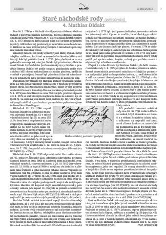 DUBEN Z HISTORIE 7Star%u00e9 n%u00e1chodsk%u00e9 rody (pokra%u010dov%u00e1n%u00ed)4. Mathias DidaktDne 16. 2. 1756 se v N%u00e1chod%u011b o%u017eenil poctiv%u00fd ml%u00e1denec Mathias Didakt s poctivou pannou Kate%u0159inou, dcerou zdej%u0161%u00edho souseda a radn%u00edho Ji%u0159%u00edho V%u00edta. Vz%u00e1p%u011bt%u00ed 29. 4. 1757 tu z%u00edskal m%u011bstsk%u00e9 pr%u00e1vo a 6. 6. 1757 koupil od farn%u00ed nadace d%u016fm na Horsk%u00e9m p%u0159edm%u011bst%u00ed (nyn%u00ed %u010dp. 105 knihovna), poz%u016fstal%u00fd po zem%u0159el%u00e9m sousedu Adamovi H%u016flkovi za cenu 210 zlat%u00fdch r%u00fdnsk%u00fdch. S %u00fahradou kupn%u00ed ceny mu pomohl z%u00e1mo%u017en%u00fd tch%u00e1n.Zm%u00edn%u011bn%u00fd %u017eenich, t%u00e9%u017e n%u011bkdy uv%u00e1d%u011bn%u00fd jako Mat%u011bj Dyd%u00e1k, nebyl zdej%u0161%u00edm rod%u00e1kem. Poch%u00e1zel ze sousedn%u00edho Nov%u00e9ho M%u011bsta nad Metuj%u00ed, kde byl pok%u0159t%u011bn dne 4. 1. 1733. Jeho p%u0159edkov%u00e9 se tu anga%u017eovali v samospr%u00e1v%u011b, otec Jan Didakt byl prim%u00e1torem, d%u011bda Samuel Didakt byl hrab%u011bc%u00edm (vrchnostensk%u00fdm) rycht%u00e1%u0159em a prad%u011bda Simeon Didakt byl podle soupisu poddan%u00fdch podle v%u00edry z dubna 1651 dosud nekatol%u00edkem a radn%u00edm p%u00edsa%u0159em, bydl%u00edc%u00edm v m%u011bst%u011b v podn%u00e1jmu. Patrn%u011b byl p%u016fvodem %u017eidovsk%u00e9 n%u00e1rodnosti a po zm%u00edn%u011bn%u00e9m datu povinn%u011b konvertoval ke katolick%u00e9 v%u00ed%u0159e. P%u016fvodn%u00edm povol%u00e1n%u00edm byl Mathias Didakt vyu%u010den%u00fdm jirch%u00e1%u0159em, ale toto jinak roz%u0161%u00ed%u0159en%u00e9 %u0159emeslo zde v N%u00e1chod%u011b provozoval pouze chv%u00edli. M%u011bl tu zna%u010dnou konkurenci, tak%u017ee se v%u00edce v%u011bnoval obchodn%u00ed %u010dinnosti. Zm%u00edn%u011bn%u00fd d%u016fm na Horsk%u00e9m p%u0159edm%u011bst%u00ed prodal 5. 8. 1779 Janu Mar%u0161%u00edkovi za cenu 700 zlat%u00fdch, proto%u017ee z%u00e1pisem z 3. 8. 1779 se stal v%u00e1%u017een%u00fdm majitelem domu na n%u00e1m%u011bst%u00ed %u010dp. 45 (pot%u00e9 %u010dp. 46, nyn%u00ed na jeho m%u00edst%u011b nov%u00e1 radnice %u010dp. 40). Ten v%u00fdhodn%u011b koupil za 800 zl z poz%u016fstalosti po zem%u0159el%u00e9m po%u0161tmistru Josefu Benediktu Kiesslingovi. N%u00e1sledn%u011b 22. 12. 1786 zapsal Mathias Didakt tzv. udr%u017eovac%u00ed smlouvou p%u016fvodn%u00ed domek %u010dp. 61 v m%u011bst%u011b v hradb%u00e1ch (nyn%u00ed %u010dp. 55) za cenu 255 zl. Po dvou letech ho p%u0159enechal sv%u00fdm %u0161vagrov%u00fdm, man%u017eel%u016fm V%u00edtov%u00fdm. Obdobn%u011b 12. 10. 1787 na tzv. kauci (z%u00e1ruku) uhradil za sv%u00e9ho %u0161vagra Josefa Ernsta, zdej%u0161%u00edho chirurga, jeho dlu%u017enou %u010d%u00e1stku 400 zl za jeho nov%u011b vystav%u011bn%u00fd d%u016fm na n%u00e1m%u011bst%u00ed %u010dp. 21 (nyn%u00ed %u010dp. 18 muzeum). A kdy%u017e zm%u00edn%u011bn%u00fd l%u00e9ka%u0159 zem%u0159el, koupil tento d%u016fm v licitaci (ve%u0159ejn%u00e9 dra%u017eb%u011b) dne 1. 12. 1790 za cenu 651 zl. A obratem, 19. 7. 1791, ho prodal m%u00edstn%u00edmu sousedu Janu Fib%u00edrovi (viz NZ 09/2023) za 700 zl. N%u00e1sledn%u011b dne 6. 10. 1795 odprodal zadn%u00ed %u010d%u00e1st sv%u00e9ho domu %u010dp. 45, stoj%u00edc%u00ed v %u017didovsk%u00e9 ulici, zdej%u0161%u00edmu %u017eidovsk%u00e9mu primasu Samueli Bondy za cenu 1000 zl. Samotn%u00fd d%u016fm pak prodal, resp. v%u00fdhodn%u011b vym%u011bnil, trhovou smlouvou z 20. 10. 1810 (zaevidovanou 20. 12. 1811) za kapit%u00e1l 7000 zl zdej%u0161%u00edmu obchodn%u00edku s pl%u00e1tnem Janu %u0160r%u016ftkovi a jeho man%u017eelce Johan%u011b, rozen%u00e9 Vogelov%u00e9 ze Sn%u011b%u017en%u00e9ho (viz NZ 10/2023). Ti mu ji%u017e d%u0159%u00edve zastavili sv%u016fj d%u016fm v rohu n%u00e1m%u011bst%u00ed %u010dp. 77 (nyn%u00ed %u010dp. 68). Tento d%u016fm pak prodal 30. 9. 1808 magistr%u00e1tn%u00edmu radovi Anton%u00ednu Rechovi za cenu 1500 zl. Z%u00e1rove%u0148 v n%u011bm z%u016fstal jako podn%u00e1jemn%u00edk, maj%u00edc%u00ed zde sv%u016fj kupeck%u00fd kr%u00e1m. Mezit%u00edm t%u00e9%u017e kupoval zdej%u0161%u00ed zem%u011bd%u011blsk%u00e9 pozemky, pole a louky, celkem jich zapsal 13. Obvykle se jednalo o lukrativn%u00ed nemovitosti na Roudn%u00e9m nebo po zem%u0159el%u00fdch z%u00e1mo%u017en%u00fdch m%u011b%u0161%u0165anech, nap%u0159. V%u00e1clavu H%u00e1jkovi (viz NZ 03/2025). N%u011bkter%u00e9 z nich pronaj%u00edmal %u010di je zastavoval ve sv%u00fdch patrn%u011b v%u00fdhodn%u00fdch obchodech. Mathias Didakt se tak%u00e9 intenzivn%u011b zapojil do m%u00edstn%u00edho ve%u0159ejn%u00e9ho %u017eivota. Ji%u017e v l%u00e9t%u011b 1763, p%u0159i na%u0159%u00edzen%u00e9 renovaci (obnov%u011b) m%u011bstsk%u00e9 rady, se mu nel%u00edbilo jmenov%u00e1n%u00ed souseda Franti%u0161ka Zeidlera radn%u00edm. Za tento sv%u016fj troufal%u00fd protest byl na%u0159%u00edzen%u00edm samotn%u00e9ho Davida Anton%u00edna N%u00fdvlta, tehdej%u0161%u00edho pana direktora (%u0159editele) n%u00e1chodsk%u00e9ho panstv%u00ed, vsazen do m%u011bstsk%u00e9ho arestu (v%u011bzen%u00ed) na %u010dty%u0159i t%u00fddny a m%u011bl zaplatit s t%u00edm spojen%u00e9 v%u00fdlohy. Ale nem%u011bl hotov%u00e9 pen%u00edze po ruce, a tak se mu vazba prodlou%u017eila o dal%u0161%u00ed t%u00fdden. Nicm%u00e9n%u011b tento konflikt ho neodradil. P%u0159i dal%u0161%u00ed renovaci m%u011bstsk%u00e9 rady dne 3. 1. 1772 byl t%u00fdm%u017e panem %u0159editelem jmenov%u00e1n a schv%u00e1len jako nov%u00fd radn%u00ed. V praxi to zna%u010dilo, %u017ee se klasicky po m%u011bs%u00edci jednou do roka st%u0159%u00eddal s ostatn%u00edmi radn%u00edmi i ve funkci purkmistra. Nav%u00edc se stal pov%u011b%u0159en%u00fdm revidentem (%u00fa%u0159edn%u00edkem, prov%u00e1d%u011bj%u00edc%u00edm kontroly) tzv. magac%u00ednsk%u00e9ho %u00fa%u010dtu (asi skladov%u00fdch z%u00e1sob) m%u011bsta. Za tuto %u010dinnost m%u011bl b%u00fdt placen. V %u010dervnu 1774 se do%u017eadoval mzdy 150 zlat%u00fdch, ov%u0