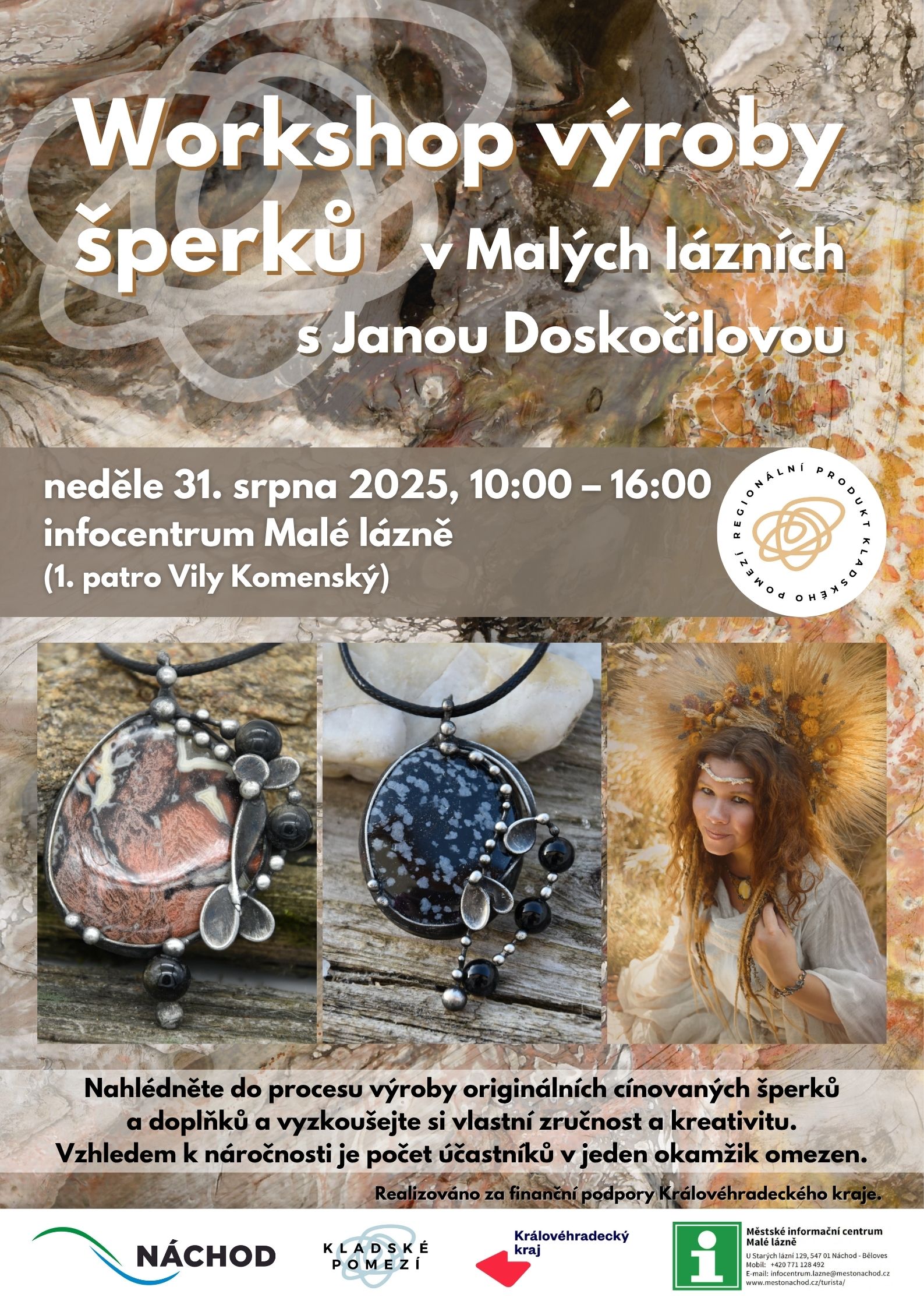 Zveme vás do Malých lázní v Náchodě-Bělovsi na workshop výroby šperku pod vedením Jany Doskočilové, jejíž výrobky se pyšní označením Regionální produkt Kladského pomezí.