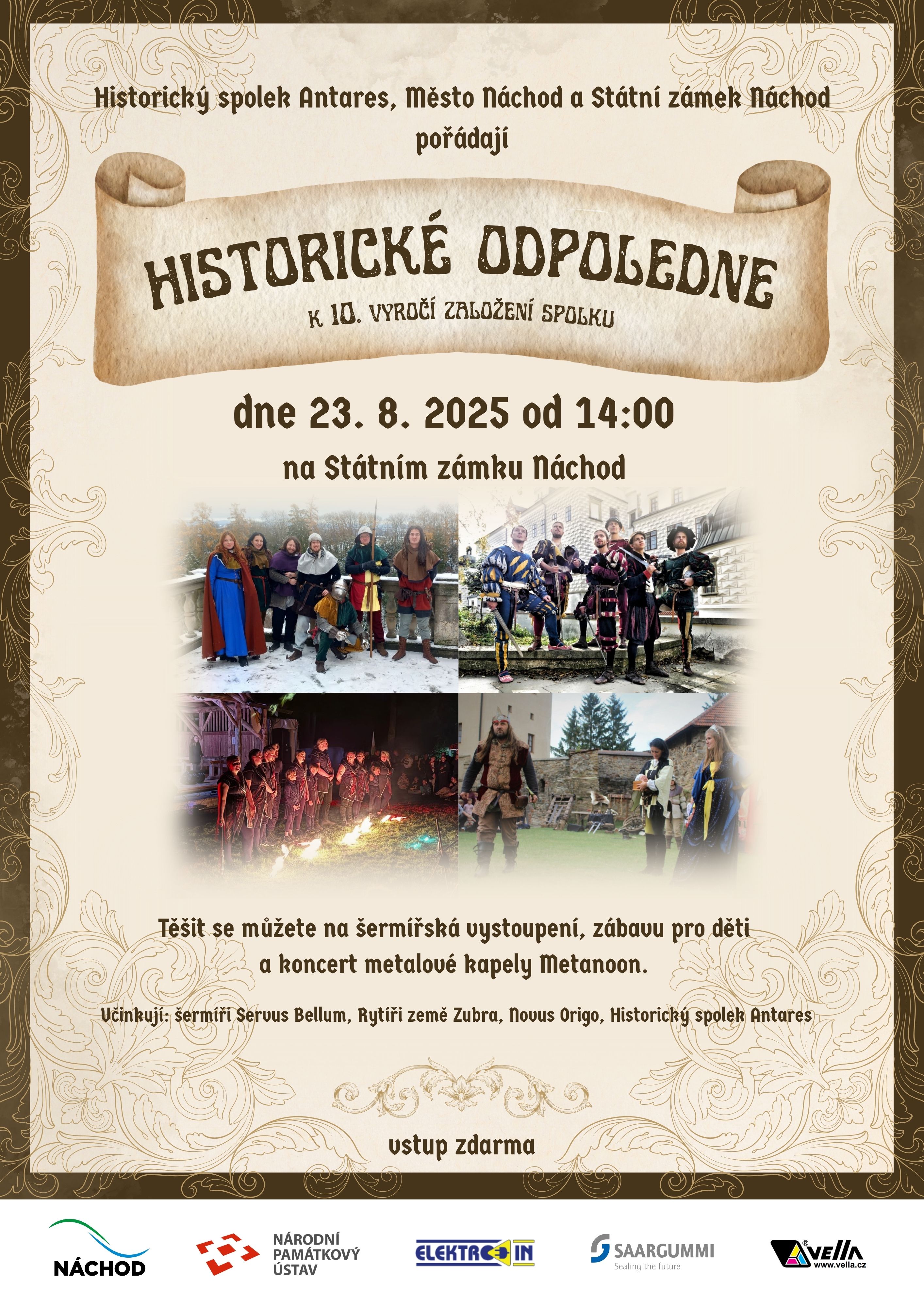 Přijďte oslavit 10. výročí založení Historického spolku Antares na velkolepou historickou akci plnou zážitků, která se uskuteční v sobotu 23. srpna 2025 od 14:00 na Státním zámku Náchod.