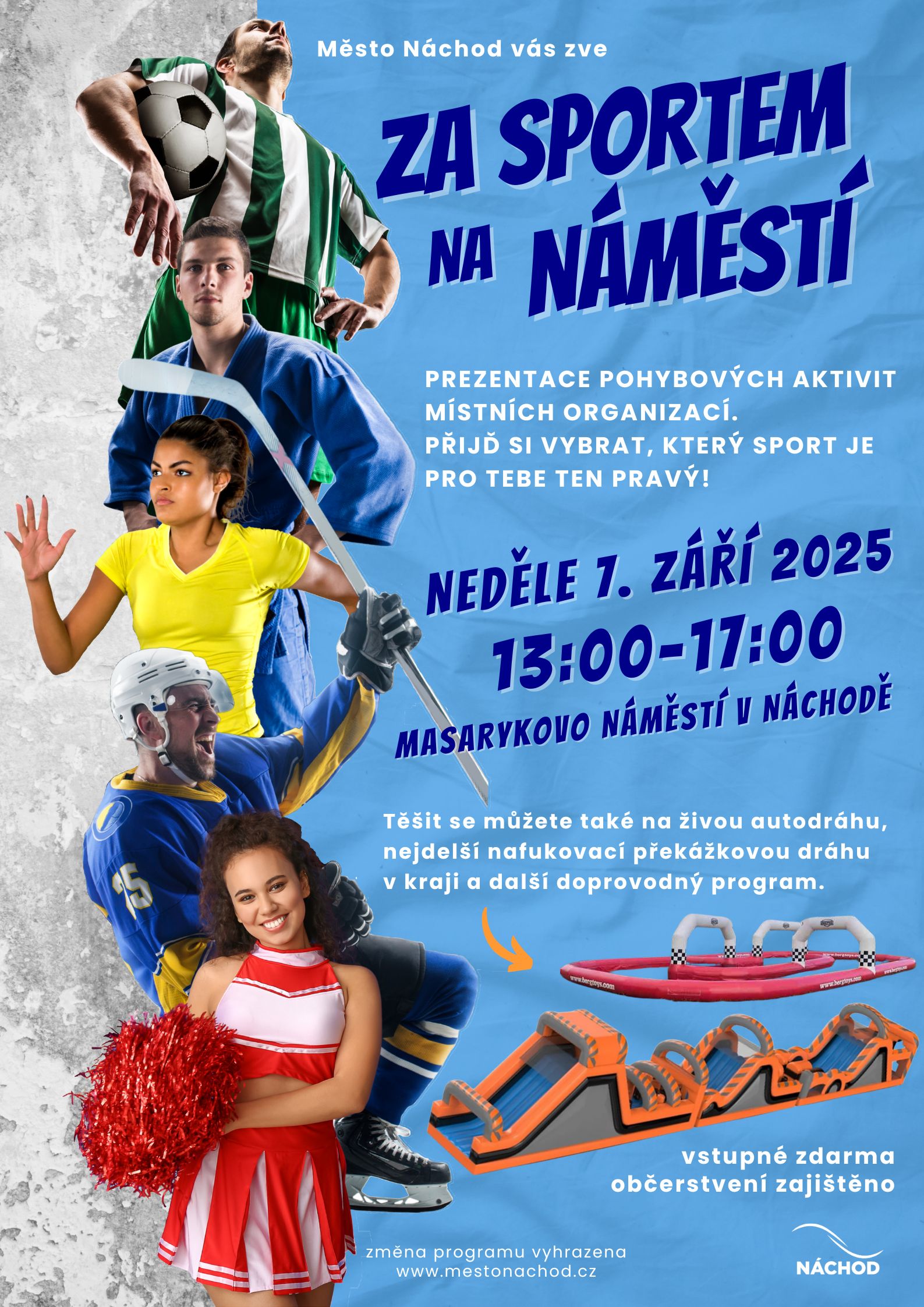 V neděli 7. září 2025 jste srdečně zváni na Masarykovo náměstí do Náchoda, kde se vám představí náchodské spolky věnující se volnočasovým a pohybovým aktivitám.