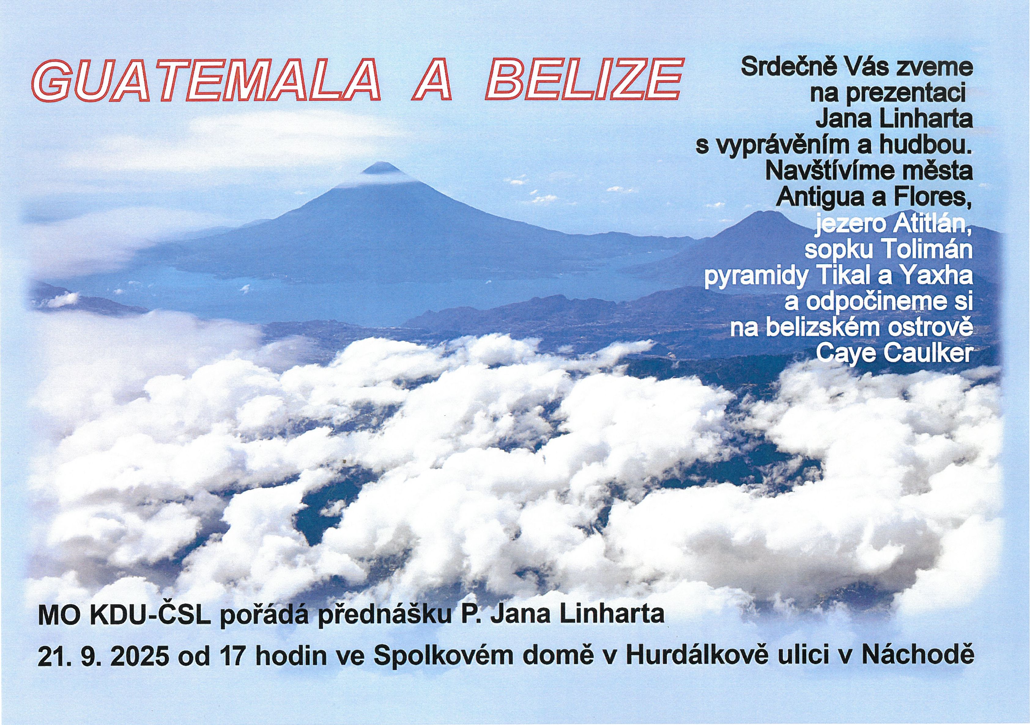 Guatemala a Belize Spolkový dům Náchod Náchod 21.09.2025 v 17:00Vstupné: Srdečně Vás zveme na prezentaci Jana Linharta s vyprávěním a hudbou. Plakát Guatemala a Belize