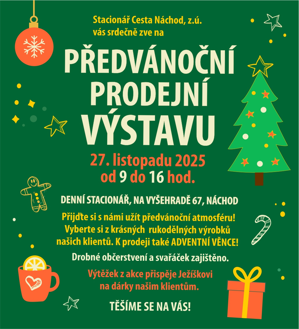 Stacionář Cesta Náchod, z. ú. vás srdečně zve na Předvánoční prodejní výstavu, která proběhne 27. listopadu 2025 od 9:00 do 16:00 v denním stacionáři (ul. Na Vyšehradě 67).